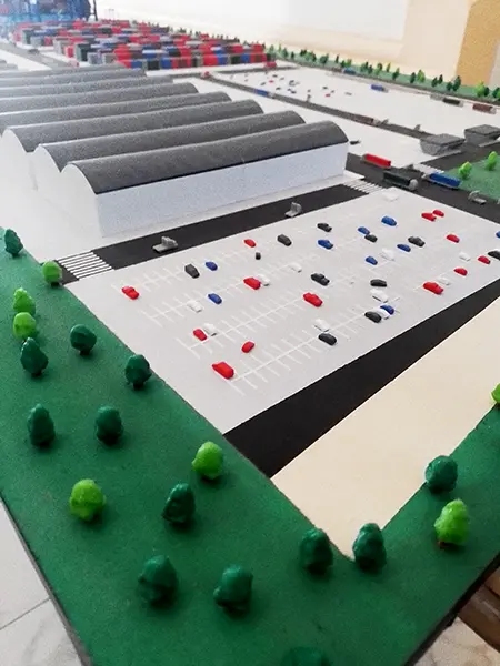 El trabajo comenzó con la recopilación de datos y referencias necesarias para comprender el proyecto y dar inicio al diseño. Se definió una maqueta principal de 1×2 m, lo que requirió un meticuloso análisis para establecer la escala adecuada que permitiera incluir todos los elementos sin perder detalles. Además, se decidió complementar este modelo con una segunda maqueta más pequeña, de 40×40 cm, a una escala mayor. Este segundo modelo muestra la operación de la grúa STS descargando contenedores de un buque y transfiriéndolos a camiones, mientras que vagones de tren transportan también contenedores.